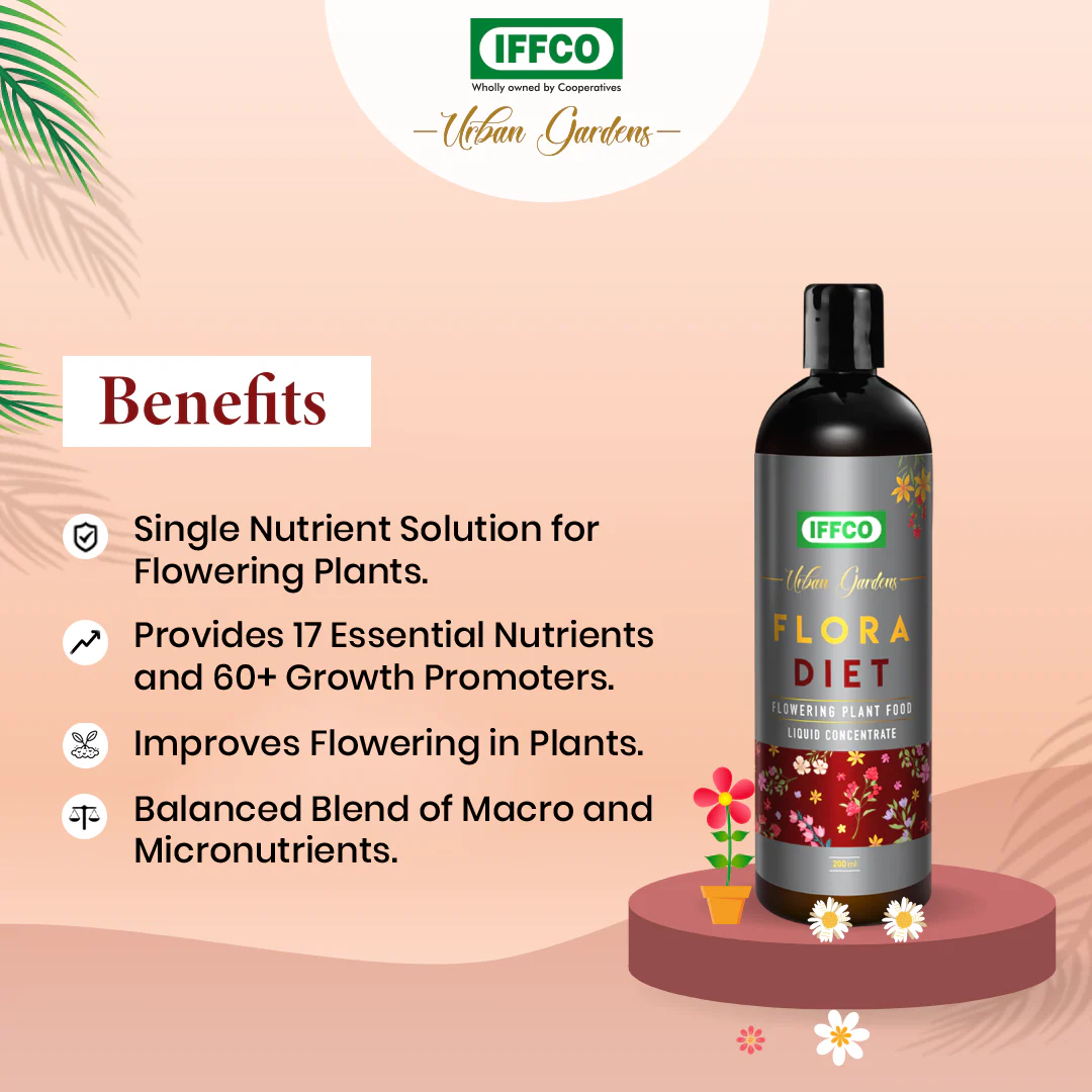Flora Diet (Water Soluble Liquid) is a balanced nutrient concentrate that has a mix of macro and micronutrients, specially formulated for blooms to induce healthy flowering and enhance metabolic functions.