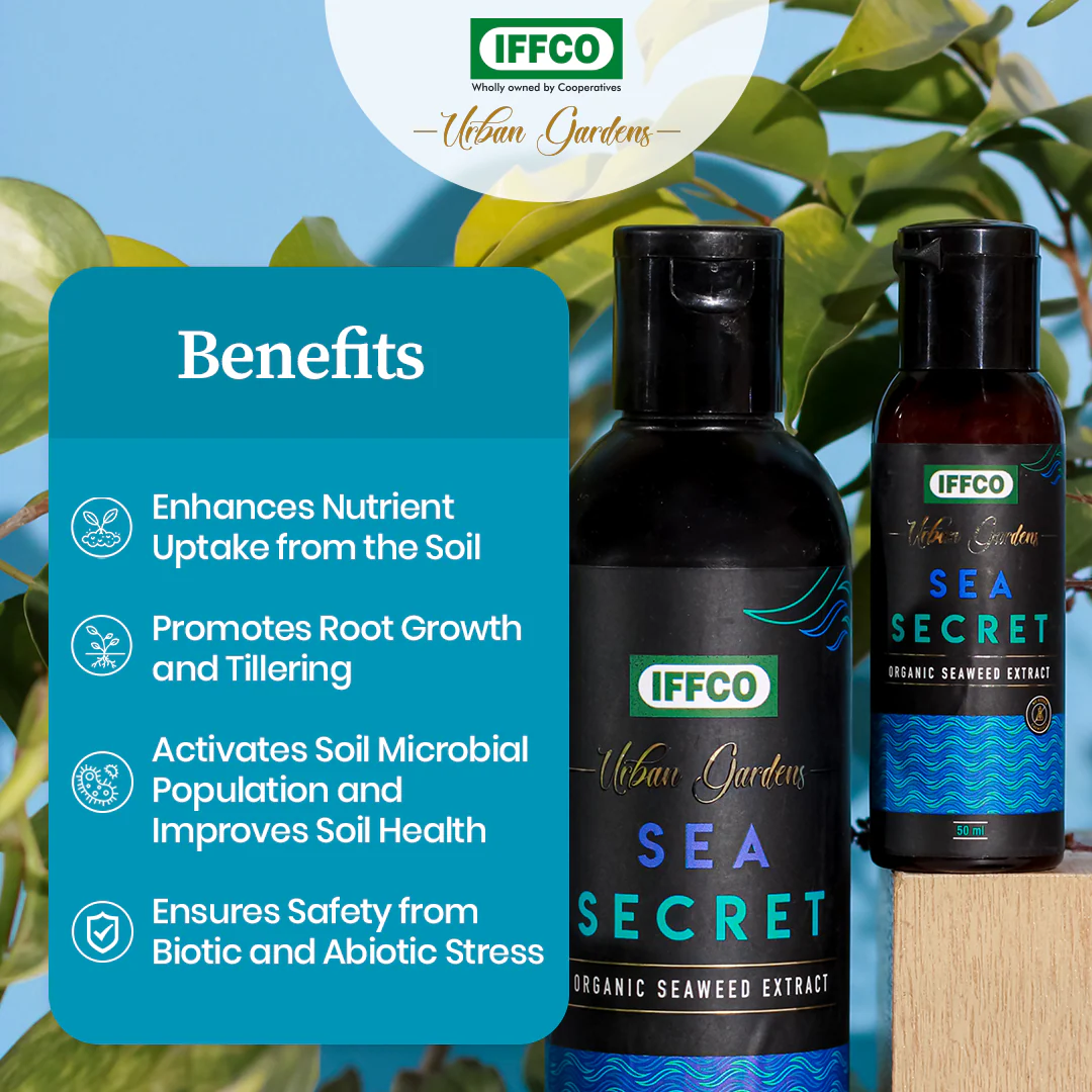 Sea Secret (Water Soluble Liquid) is a Seaweed Extract-based liquid derived from red & brown seaweed. It enhances nutrient uptake from the soil, and strengthens plant growth and stress tolerance while improving soil conditioning. It contains proteins, carbohydrates, and other inherent nutrients, vitamins, and plant growth promoters like auxins, cytokinin, gibberellins etc.